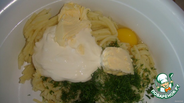 Картофель отварите, пропустите через мясорубку. Добавьте 1 сырое яйцо, сливочное масло, сметану, зелень, соль, перец и приправу, всё тщательно перемещайте