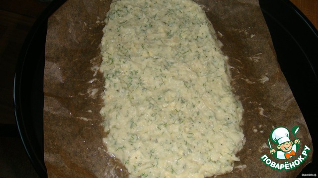 На противень положите бумагу для выпечки, смажьте её маслом. Ровным слоем выложите половину картофельной массы