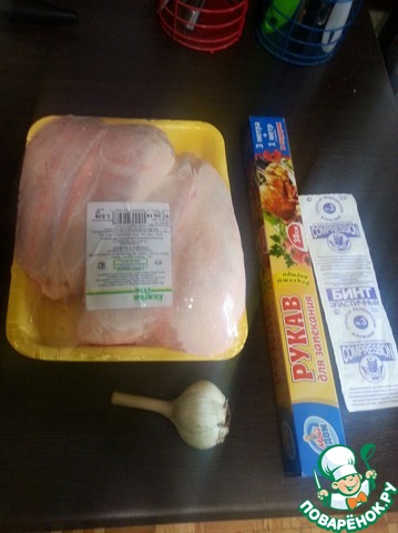 Приготовим все ингредиенты: куриная грудка, соль, перец, приправы по желанию, чеснок, рукав для запекания и трубчатый бинт (продается в аптеке и стоит рублей 10, размер 3). Бинт можно заменить обычными нитками.