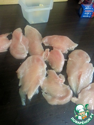Режем куриную грудку на тонкие кусочки как для отбивных. Солим перчим, посыпаем чесноком.