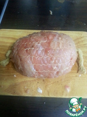 Достаем бинт, завязываем с одного конца узлом и очень плотно утрамбовываем в него курицу, после завязываем узел с другой стороны. Если бинта нет, плотно обвязываете куриный рулет нитками.