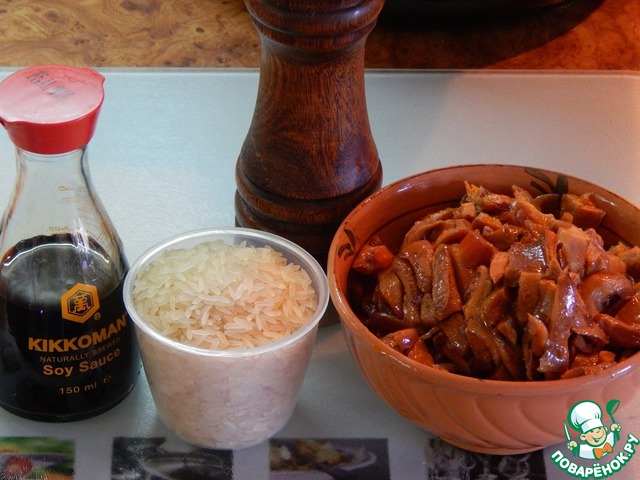 | Очень интересный и простой рецепт. В составе рис, грибы, соевый соус. Грибы я добавила такие, какие были у меня на данный момент. Очень интересное и насыщенное по вкусу получилось блюдо. С удовольствием делюсь рецептом. |