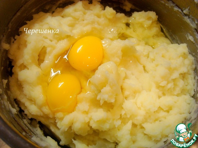 Картофель отварить в соленой воде и приготовить картофельное пюре, добавив сливочное масло и молоко. Немного остудить и добавить яйца и мускатный орех, хорошо все перемешав.