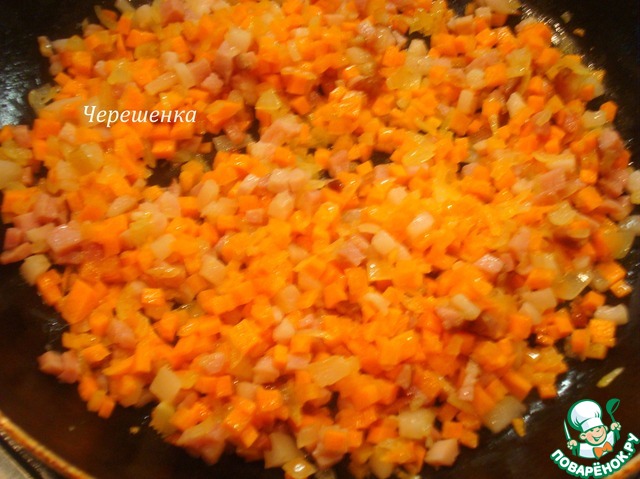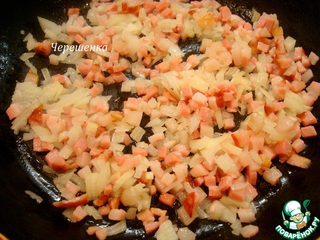 Обжарить сначала лук и грудинку минут 5.