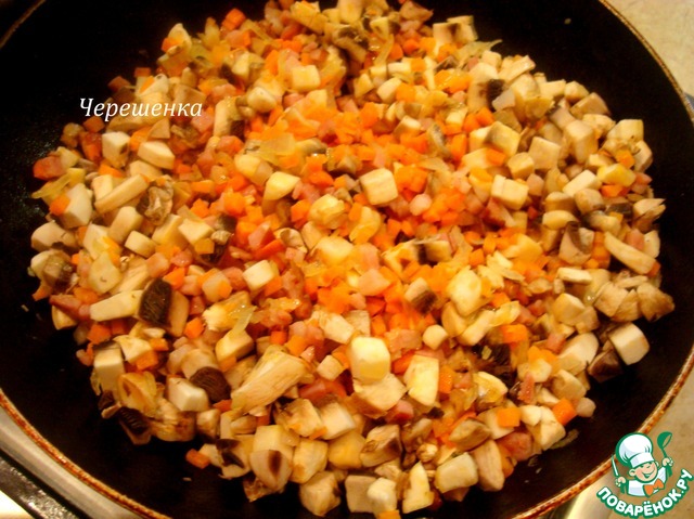 Для начинки грудинку, лук, морковь и шампиньоны порезать мелкими кубиками. Чеснок измельчить.