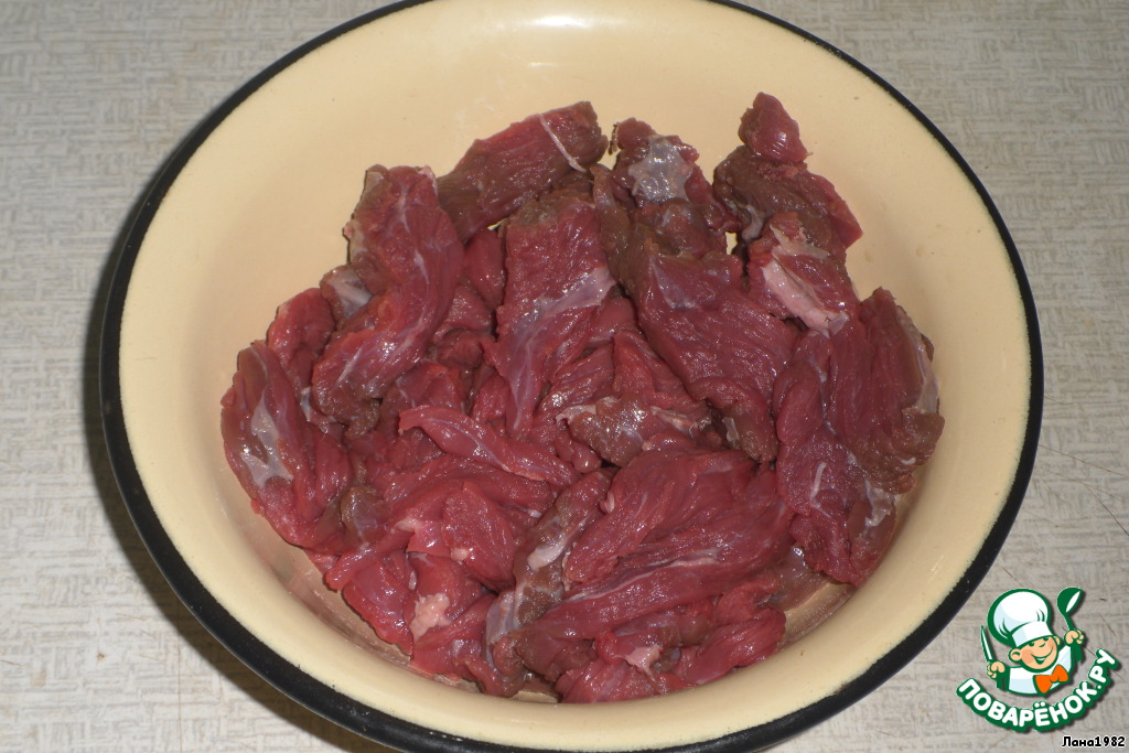 Мясо нарезаем тонкими кусочками поперек волокон. Солим, перчим, добавляем специи и обжариваем на растительном масле до румяной корочки. Уменьшаем огонь до минимума.