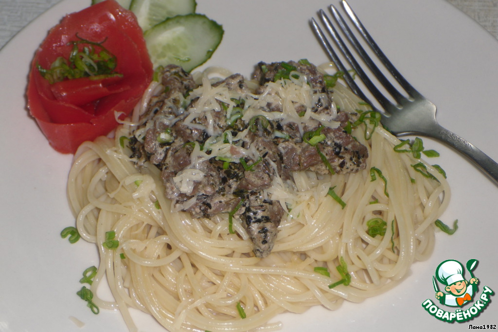 Подаем спагетти с теплым мясом, посыпав зеленью и сыром.