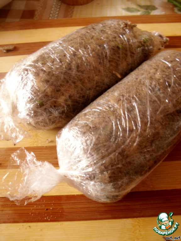На разделочной доске расстелить пищевую плёнку и выложить на неё слой остывшей грибной смеси. Поверх смеси выложить листочки шпината.