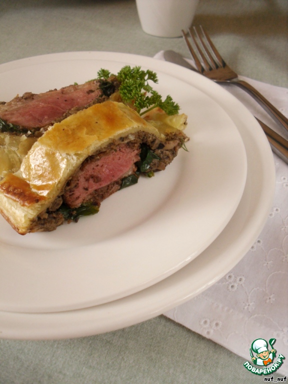 | Давно хотела приготовить "Говядину Веллингтон", но всe время находились причины (читай - отмазки). Этот рецепт только по мотивам знаменитого "Beef Wellington", но приготовлен с великой целью когда-нибудь сделать оригинальный рецепт. |