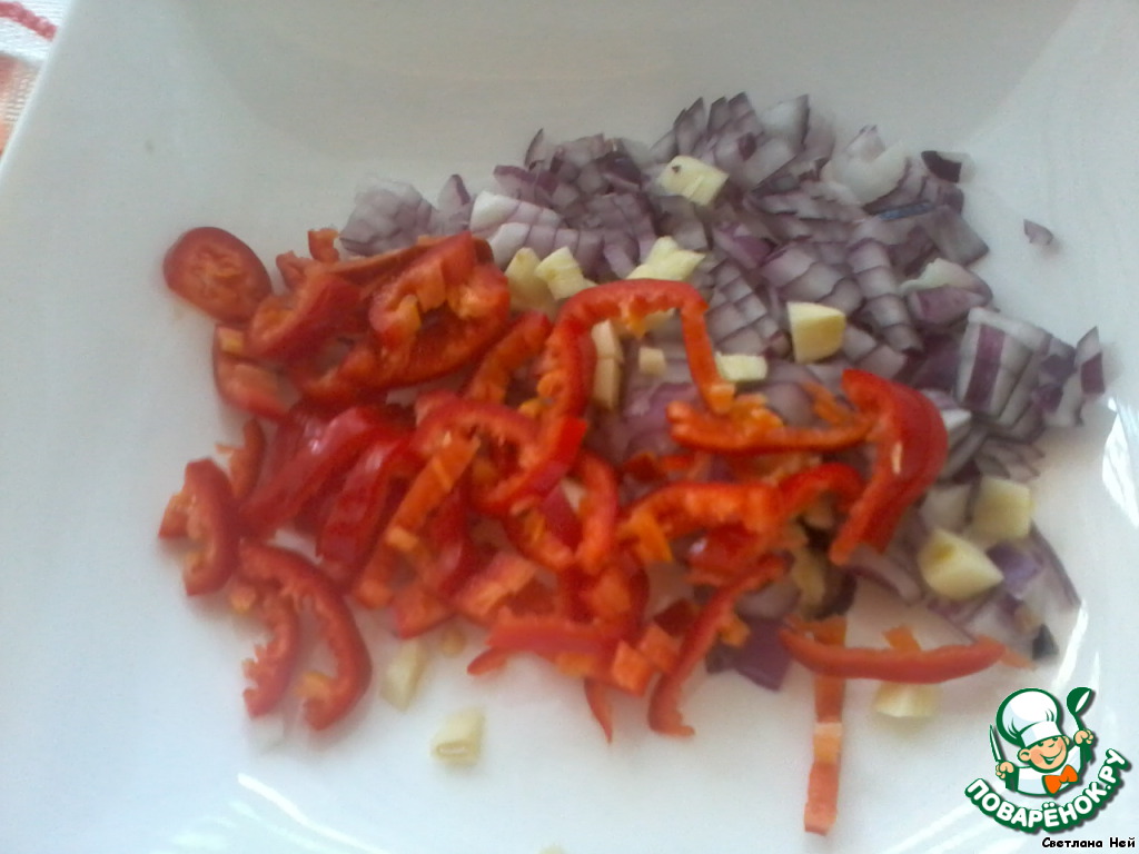 перец чили полосочками, удалив семена