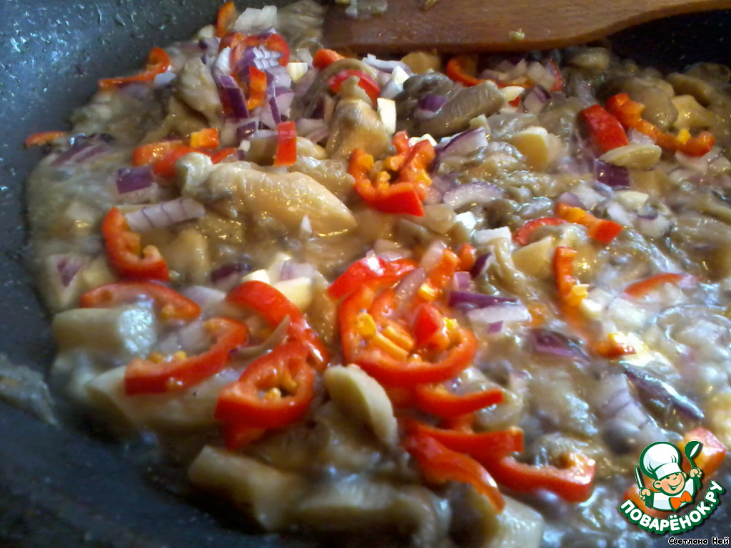 обжарить грибы и добавить к ним лук, чеснок и перчик чили. Слегка обжарить все вместе и немного спассеровать.