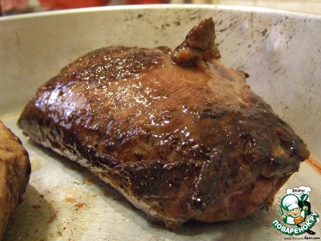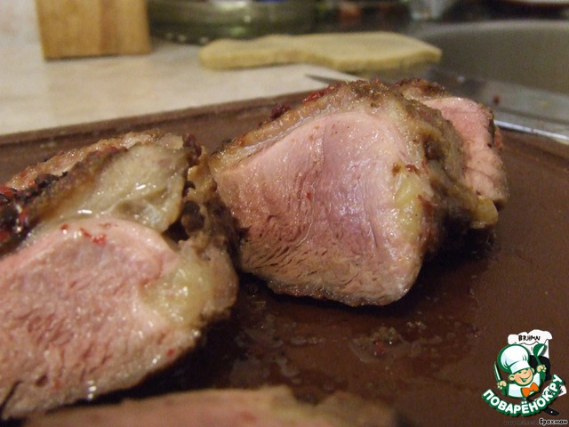 - Вынимаем из духовки, закутываем в фольгу. Можно накрыть полотенцем, дабы сохранить теплым. Мясо должно отдохнуть. Тогда все соки вернутся на место.