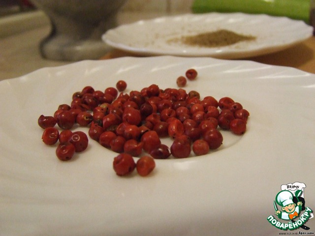 - Разогреваем духовку до 200 градусов. Достаем ступку и растираем не слишком мелко кориандр и розовый перец.