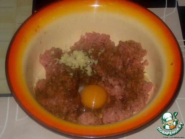 В миску выложить фарш, добавить специи, яйцо и чеснок. Смешать.