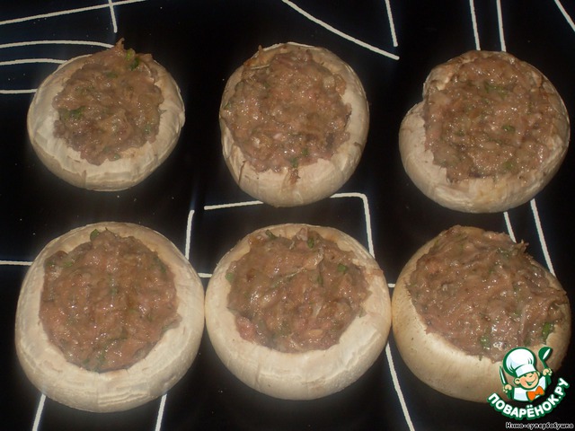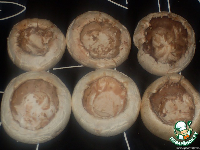 Шампиньоны очистить, осторожно выломать ножки, а затем аккуратно, маленькой ложечкой, удалить пластинки.