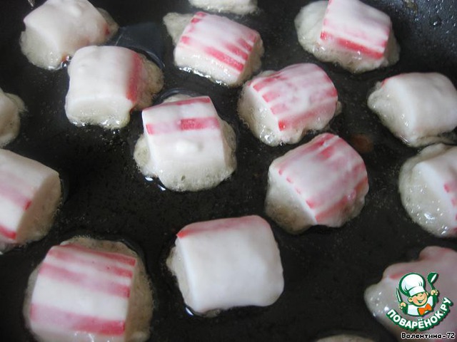 Затем палочки обмакнуть в кляр и обжарить на разогретом растительном масле до золотистой корочки.