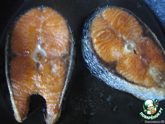 Потом стейки семги обжарить на разогретом растительном масле с двух сторон до золотистой корочки (по 5-7 минут с каждой стороны)