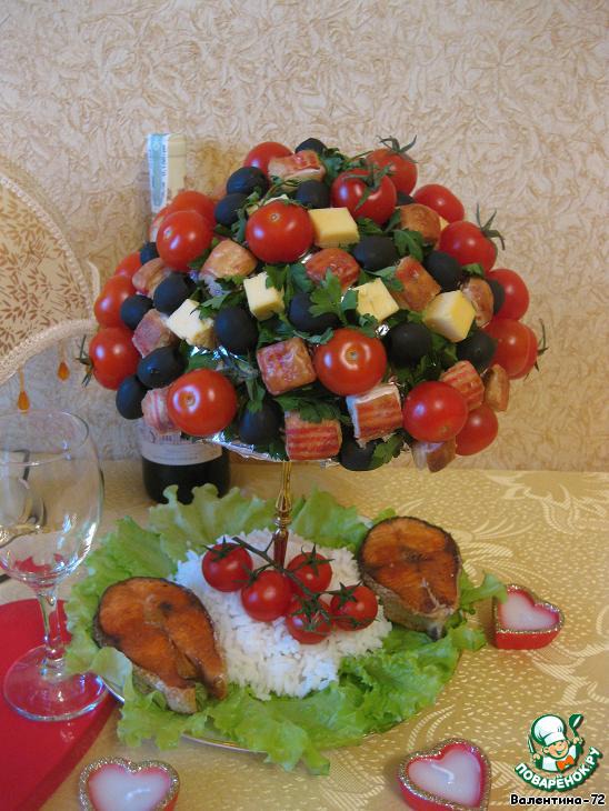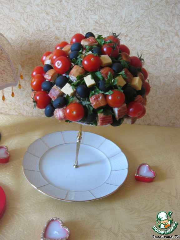 Делаем крону нашего дерева – на зубочистки насаживать оливки, сыр, помидорки, зелень, крабовые палочки в кляре.