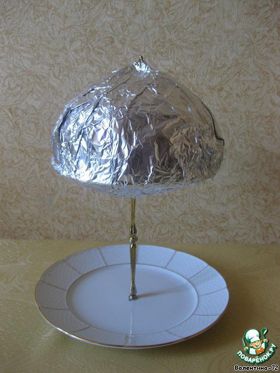кочан капусты разрезаем пополам, заворачиваем его в фольгу и кладем на верхнюю тарелку (можно заменить капусту круглым хлебом).