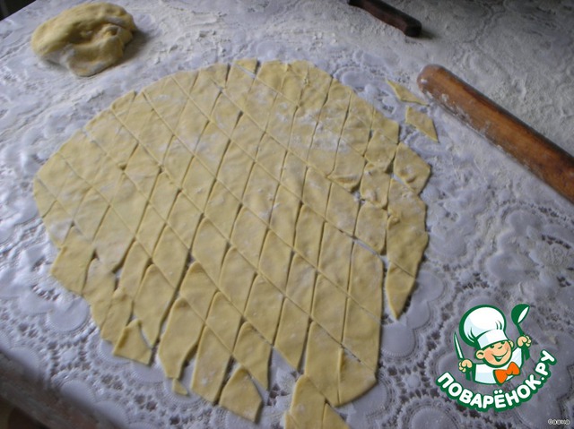 Нарезать тесто на симпатичные ромбики (не обязательно отщипывать куски теста размером 2-3см, как это делают венгерские хозяйки-это занимает слишком много времени)