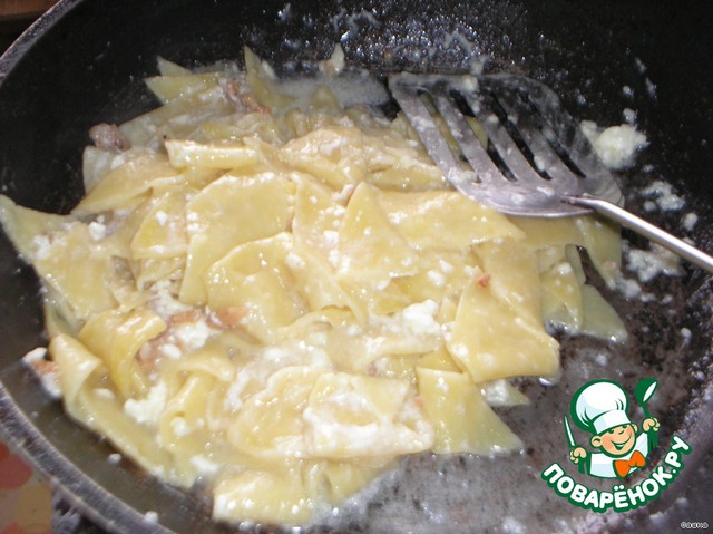 Сварить ромбики в кипящей воде до готовности (3-4мин), потом поджарить их на шкварках, додать сметану и творог в сковороду. Вуаля!