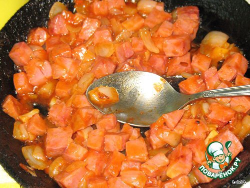 Ветчину порезать небольшими кубиками и обжарить с измельченным репчатым луком на сковороде. Добавить кетчуп и 1 ст. ложку хрена - хорошенько перемешать и выключить.