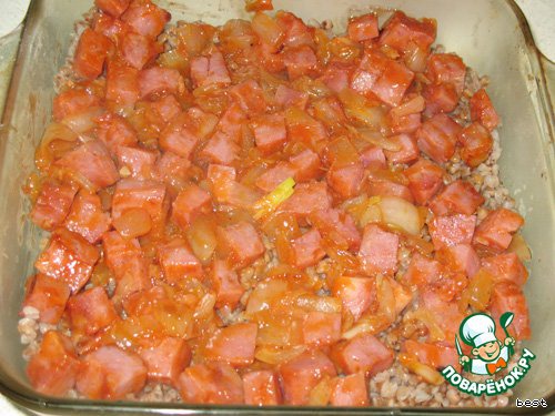 Выложить в форму половину гречки. Сверху обжаренную ветчину.