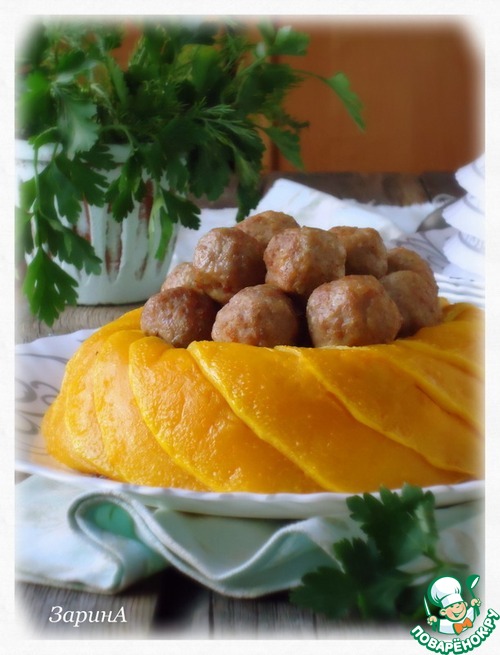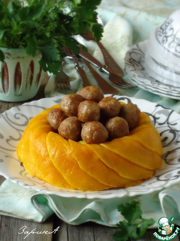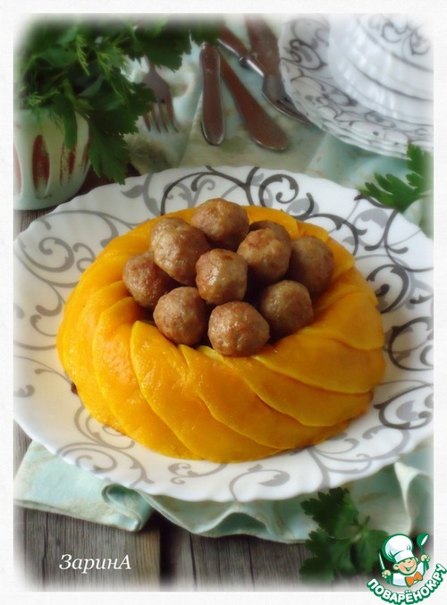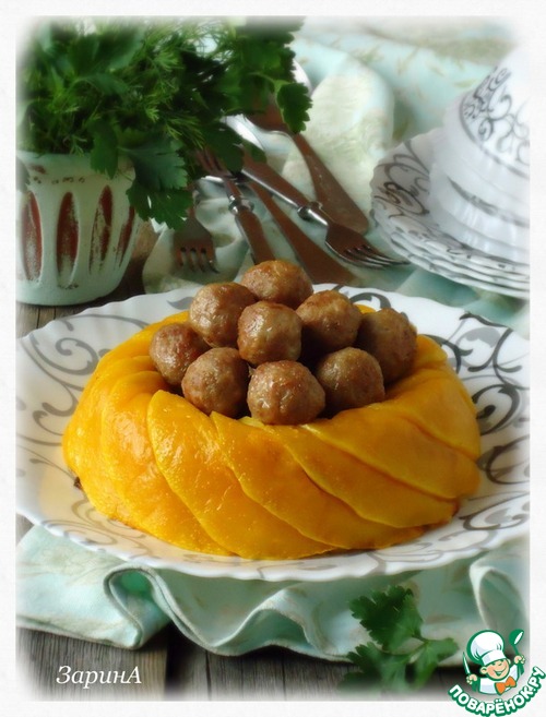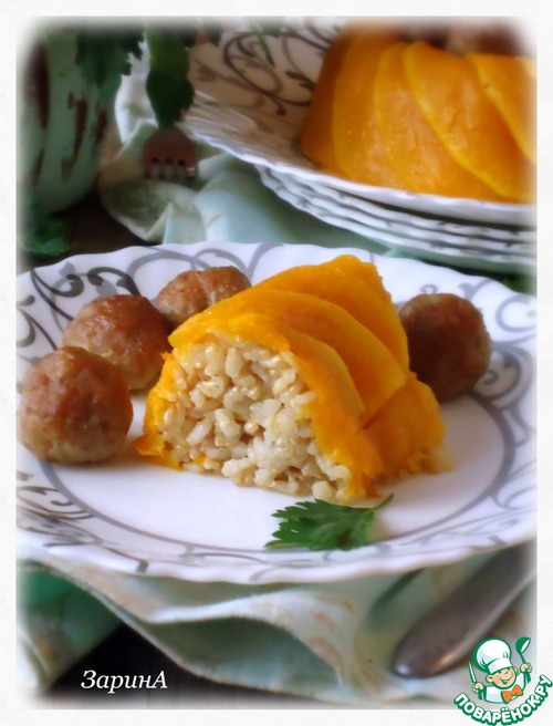 | Предлагаю попробовать еще такой вариант в знакомом вам оформлении. Рисовая "корона" с тыквой и мясными фрикадельками. Думаю, такая подача обычной запеканки заслуживает праздничного стола! За рецепт спасибо Ирине Прошуниной. |