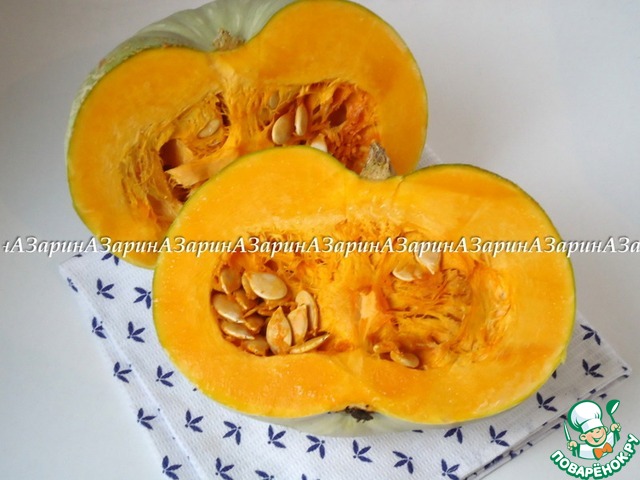 Тыкву разрезать пополам. Нам потребуется половинка небольшой тыквы. Кожуру снять, а так же вынуть семечки.
