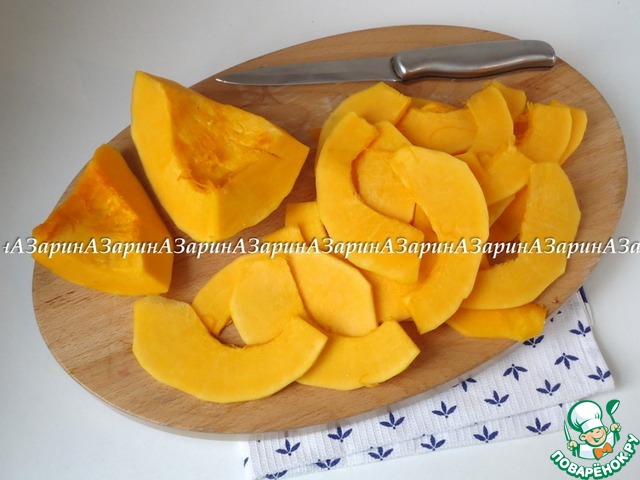 Нарезать тыкву тонкими пластинами в 3-4 мм толщиной.