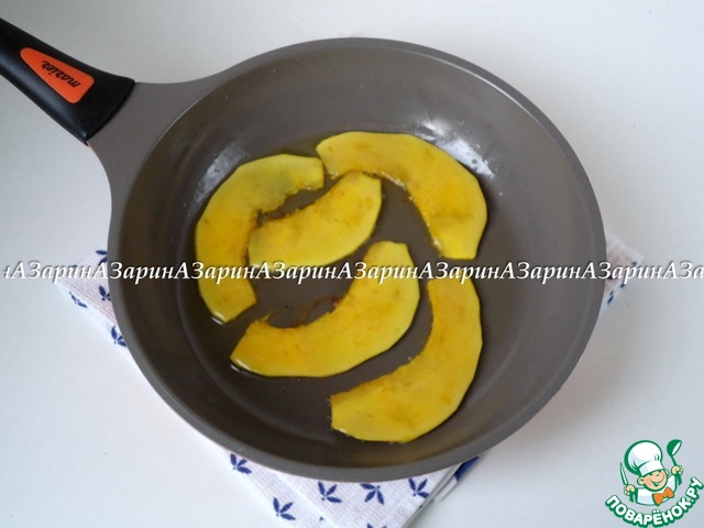 Растопить сливочное масло. Слегка, с двух сторон обжарить тыкву, немного её присаливая. Все обжаренные пластинки перекладывать на тарелку.