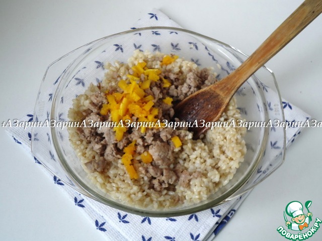 Разделить фарш: 1/3 обжарить на сковороде и смешать с рисом и сыром. Так же я добавила немного нарезанной, обжаренной тыквы.