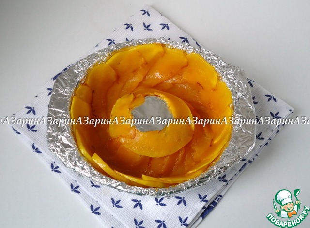 В форму с отверстием по середине выложить тыквенные пластинки плотно друг к другу (даже немного заходя друг на друга).