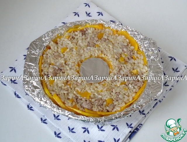 Сверху выложить рис с фаршем и легонько утрамбовать. Форму с рисом поставить запекаться в заранее разогретую духовку до 200 гр. на 20 минут.