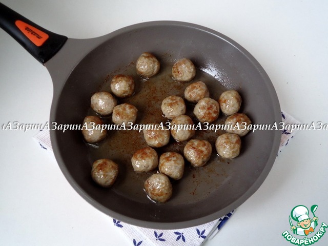 Пока рис с фаршем в духовке, приготовить фрикадельки. Из оставшейся 2/3 фарша сформовать шарики с маленький грецкий орех и обжарить их на сливочном масле до готовности со всех сторон.