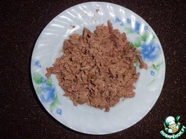 Пока они варятся, разминаем вилкой печень трески. Можно не мельчить.