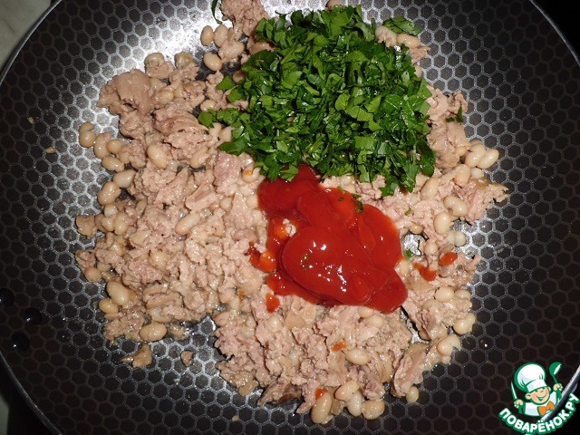На сковороду отправляем печень трески, фасоль, томатный соус, мелко нарезанную зелень, прогреваем. После добавляем туда спагетти, солим, перчим, перемешиваем и снова прогреваем..