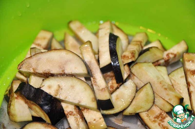Баклажаны моем, нарезаем полосками, обильно солим и отставляем на 10 минут.