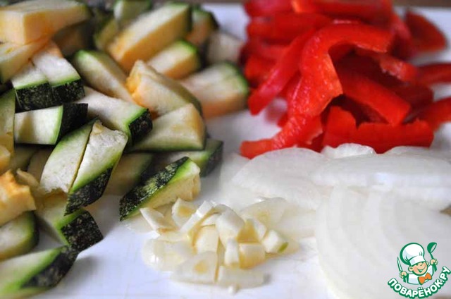 Остальные овощи моем, чистим, цуккини и болгарский перец нарезаем полосками, лук полукольцами, чеснок мелкими кубиками.