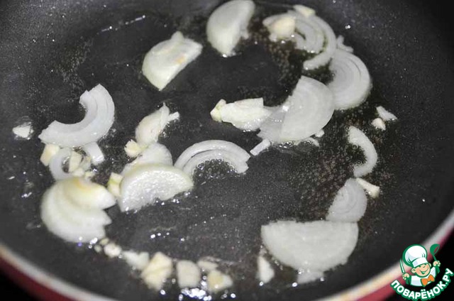 На сковороду наливаем оливковое масло, кладём лук и чеснок и пассеруем 2 минуты.