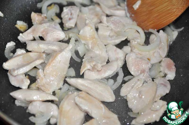 Всё перемешиваем, добавляем бульон и тушим на среднем огне при закрытой крышке 15 минут.