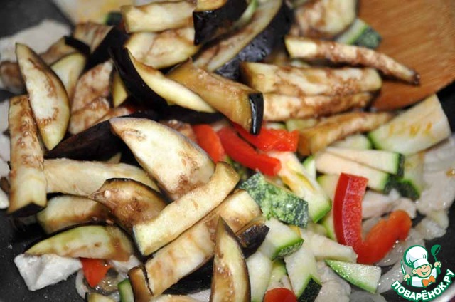 Баклажаны промываем, отжимаем. Кладём на сковороду, туда же кладём цуккини и болгарский перец. Всё перемешиваем и обжариваем 2 минуты.