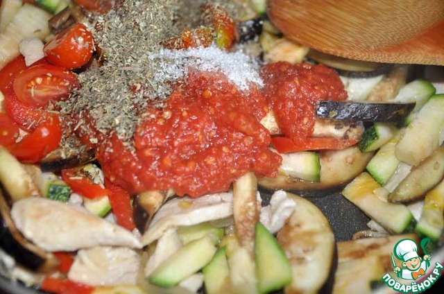 | Сегодня хочу предложить Вам блюдо французской кухни - рататоли. Кто-то, может быть, спросит: какая разница между рататуем и рататоли? Иногда никакой, потому, что рататуй – французское овощное рагу, которое изначально готовилось из кабачков, помидоров, перца, лука и чеснока. Позднее в рататуй стали добавлять баклажаны. Рататоли - изначально баклажанное блюдо из тех же составляющих, разве что баклажанов берут немного больше. Рататуй можно приготовить без баклажанов, а рататоли - нет. Мой вариант с добавлением куриного филе, хотя можете обойтись без него, тогда это будет постное блюдо. |