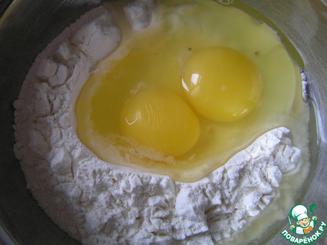 Приготовить тесто. Яйца смешать с мукой и щепоткой соли.