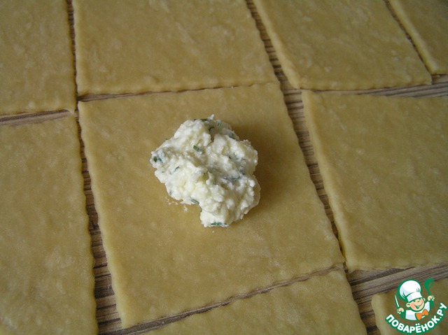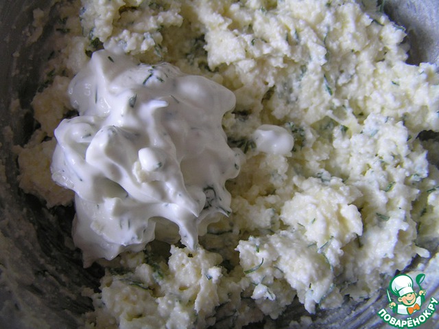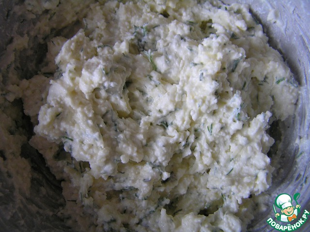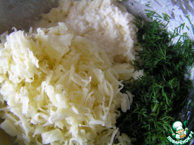 А пока приготовить начинку. Творог смешать с тертым сыром и зеленью.