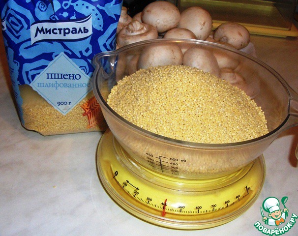 Отмеряем 400 г пшена, его нужно очень хорошо промыть горячей водой. Высыпать в кастрюлю, залить холодной водой выше крупы примерно на 5 см. Посолить по вкусу. Варим под крышкой примерно 30 мин. Я варю в мультиварке.