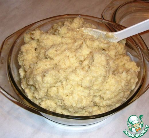 Каша должна получится очень крутой и хорошо распаренной. Добавить молотый чёрный перец, хорошо перемешать. Остудить. Это наше тесто.