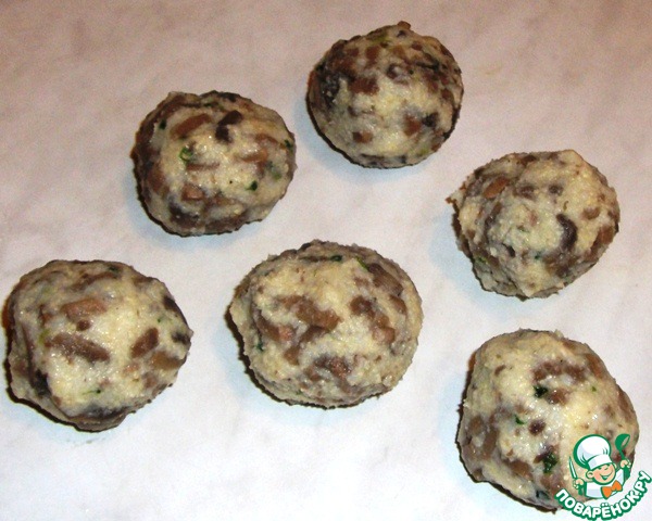 Последние 6 штук на пробу сделала так: смешала пшённое тесто с грибной начинкой и накатала шарики. Крокеты обмакнуть в слегка взбитые яйца, обвалять в панировочных сухарях и обжарить во фритюре из растительного масла. Этот шаг, к сожалению, забыла запечатлеть.