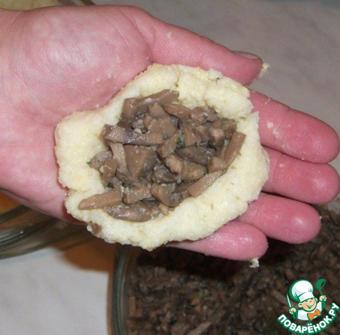 А теперь лепим наши крокеты. Руки смочить холодной водой, взять в ладонь немного пшённого теста, размять его в лепёшечку, положить грибную начинку и...