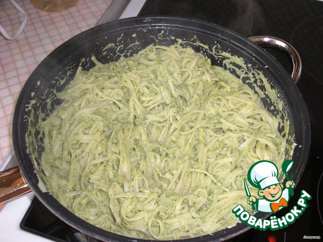 | Эту вкусную пасту я начинала делать с использованием петрушки. А затем попробовала и другие варианты зелени - получается тоже очень хорошо. Главное - как и для любой пасты - не переварить макароны и сделать вкусный соус. Соус из 4 -х ингредиентов - зелень, сливки, соль, белый молотый перец. |